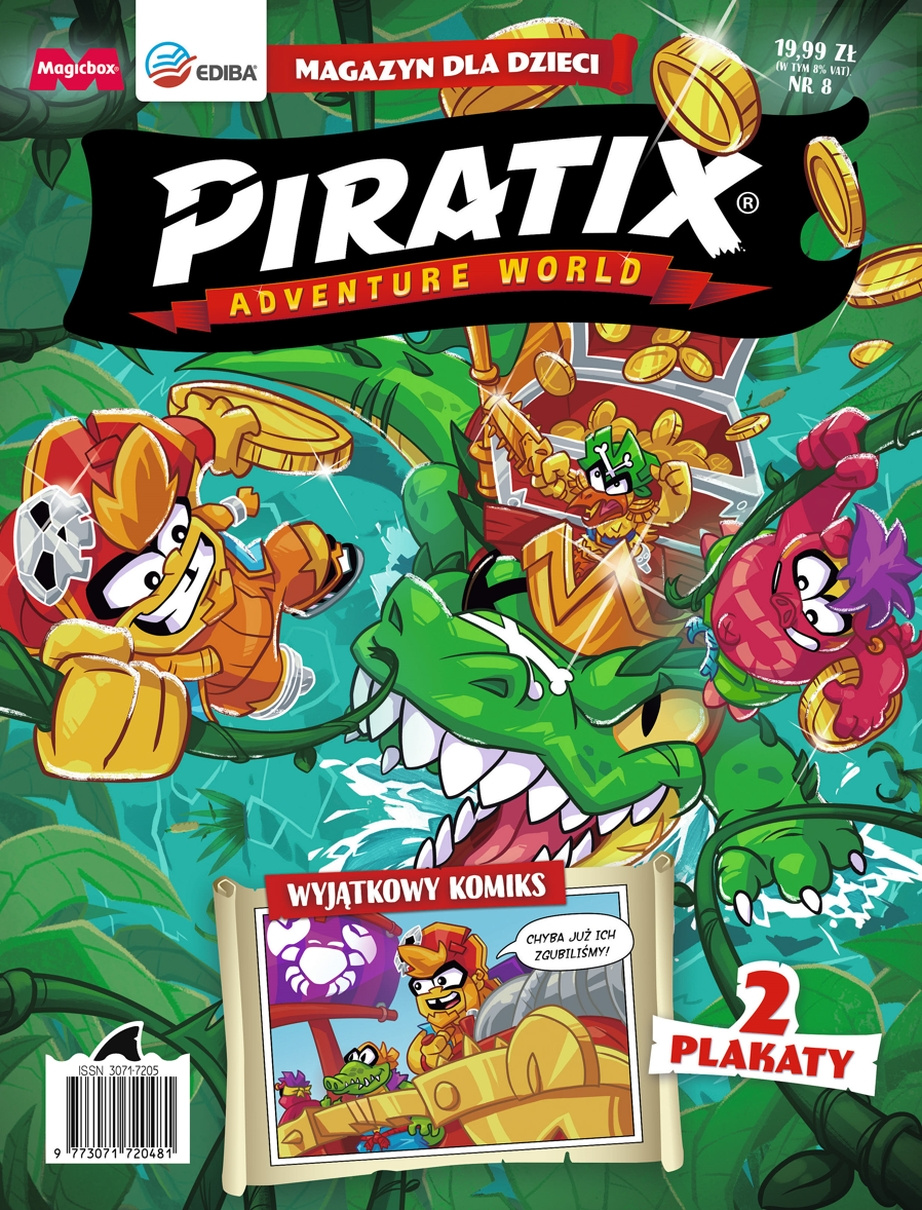 Ahoy mali żeglarze! Nowe pirackie przygody na horyzoncie. Znajdziecie je w najnowszym wydaniu magazynu Piratix nr 8. Tym razem przygotowaliśmy dla Was pasjonujące morskie opowieści, wciągające zabawy oraz łamigłówki. Pokażemy wam, jak prosto wykonać armatę oraz domowy teleskop. W tym wydaniu znajdziecie również fascynującą historię przedstawioną w komiksie oraz dwa barwne miniplakaty. Dodatkowo mamy dla Was niespodziankę: strój piracki do wycięcia i pirata, którego w niego ubierzecie! Do magazynu dołączone są trzy figurki z serii Crazy Jungle. Wysyłka losowa.